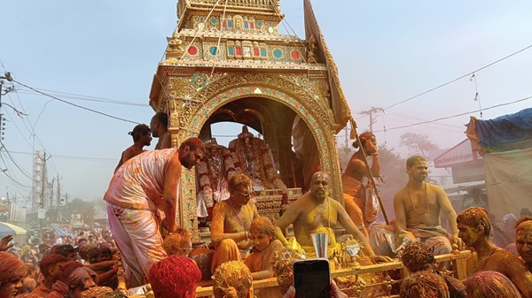 Vrindavan Rangnath Temple Brahmotsav: कांच के विमान पर सवार होकर भगवान गोदा रंगमन्नार ने खेली होली, रंगों में सराबोर हुए भक्त